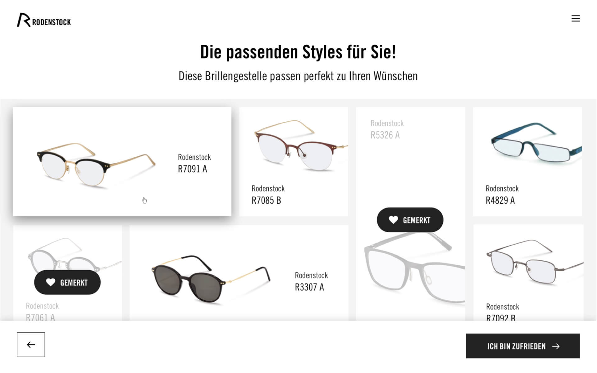 2. Digitaler Brillenberater: Zudem entwickelten wir einen digitalen Produktberater. Dieser basiert auf den Beratungsgesprächen der Optiker und führt die Nutzer interaktiv durch eine eigens konzipierte Beratungsheuristik. Mithilfe eines Konfigurators können Nutzer ihre Brille veredeln. Dieser Prozess dient nicht nur der umfassenden Information, sondern auch der Leadgenerierung, indem die Leads direkt an den passenden Optiker übermittelt werden. Die technische Umsetzung umfasste die Anbindung an SAP zur Produktfindung.